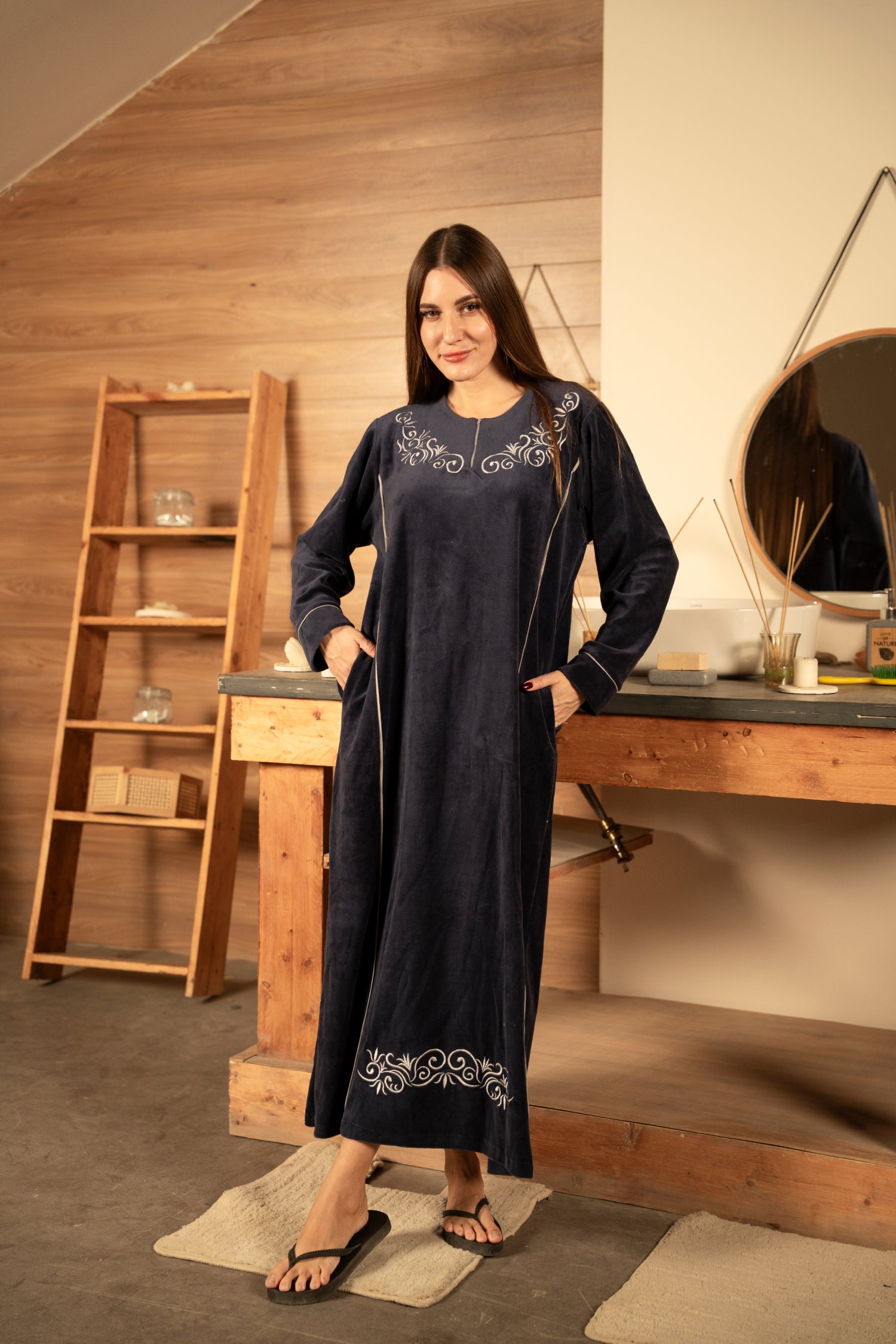 قميص نوم شتوي قطيفة بسوستة مطرز