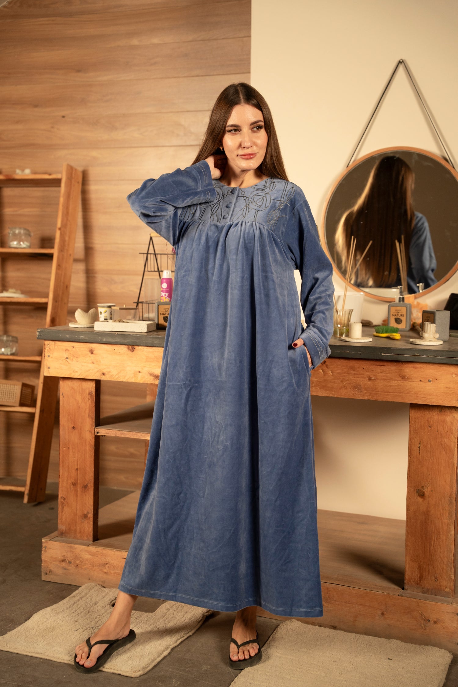 قميص نوم شتوي قطيفة بسفرة مطرز