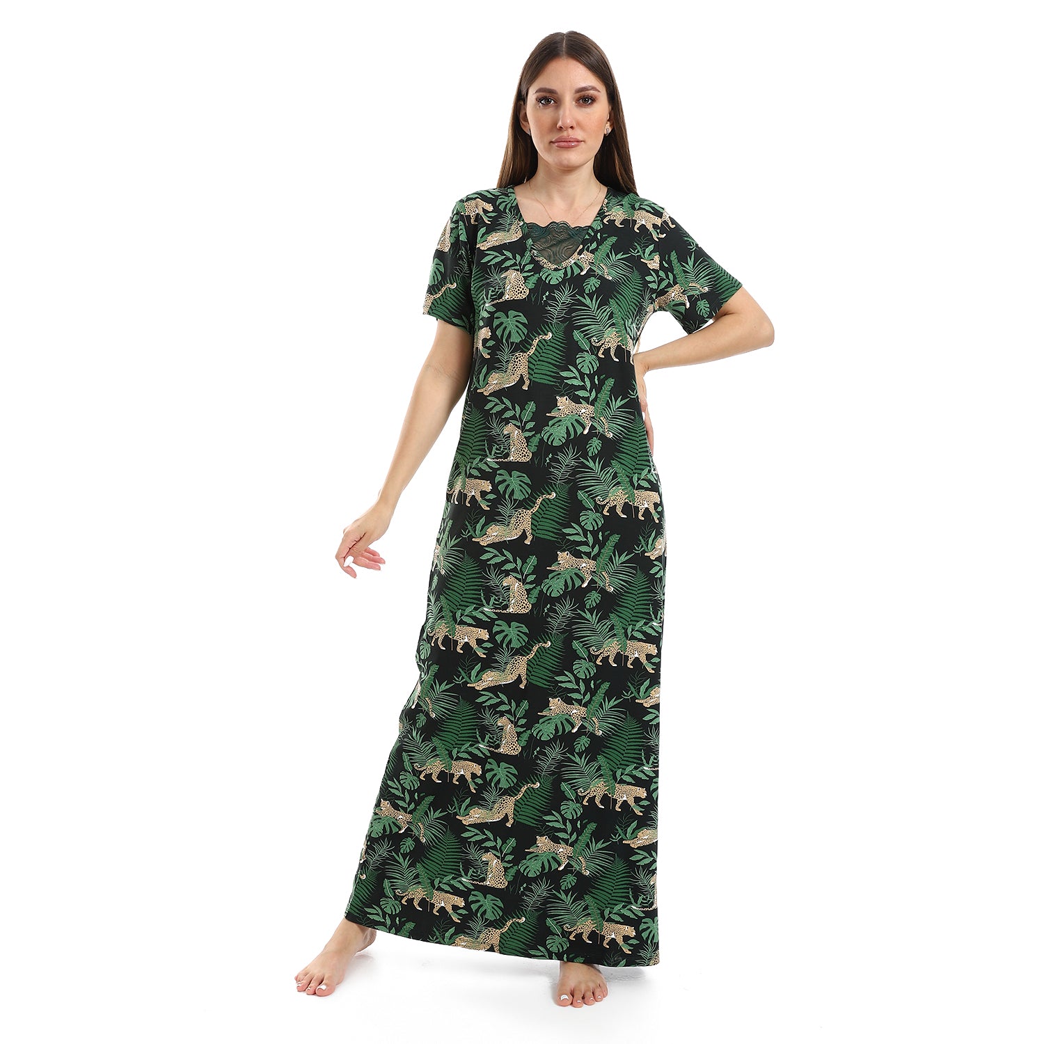قميص نوم طويل نصف كم فيسكوز مشجر بالدانتيل